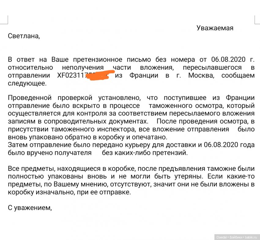 Указать номер авианакладной, трек, описать содержимое и ТП…
