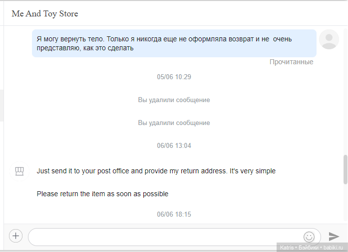 Не знаю, можно ли оформить возврат после завершения спора, но, блин, я же спрашивала! И никакого кода мне не прислали. Про «укажите обратный адрес» (иероглифами?) отдельно смешно. Следующими сообщениями меня поторапливали идти на почту, пока я чесала затылок. Ладно, еще раз спасибо.