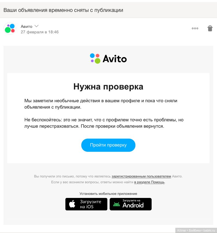 Вот такое сообщение пришло мне сегодня на электронную почту от Авито: