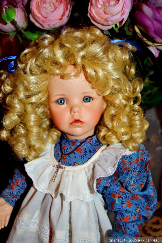 Вот имя третьей куколки я не помню, по возвращению загляну в ее паспорт. Она меня очень тронула своим выражением лица и взглядом. У нее такие бездонные глаза, что я смотрю и не могу насмотреться. Какие то мистические и завораживающие глазки, очень романтичная девочка и нежная. Я очень ее люблю. Это авторская работа Эффнер и очень редкая. Я никогда не видела второй такой девочки.