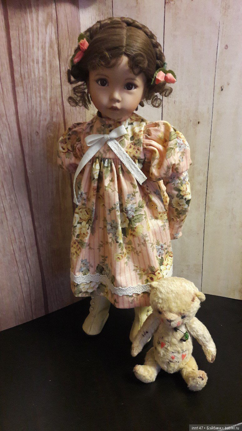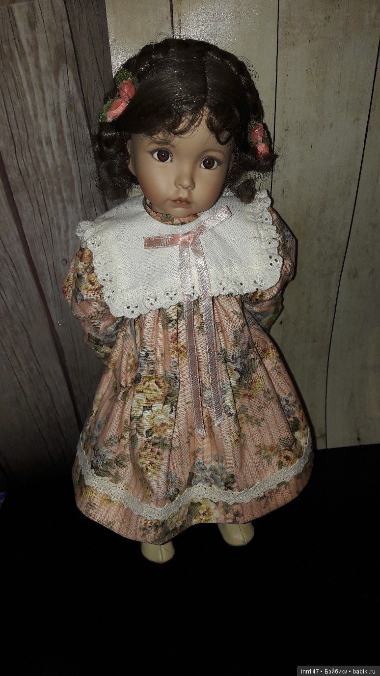 Здравствуйте, уважаемые коллекционеры! Сегодня я хочу написать о своей куколке Дианы Эффнер — Эмили. Я очень долго искала эту куколку, как то не успевала ее купить, или она была уже проданна или не продовалась совсем… Тогда я решила купить куколку по молду Эмили фирмы EXPRESSIONS. Но и там меня ждало разочарование- куклы мало чем походили на оригинальную Эмили… и парики не то, и одежда не та… все не то… И вот моя подруга присылает мне фото куколки из Германии, кукла довольно старая, 1991 года, 51 см, платье довольно поношенное, выгоревшее… но на меня смотрела Эмили! И я купила ее не торгуясь, хотя куколка стоила довольно дорого. Ну вот, наконец, у меня есть моя Эмили! Первым делом я сшила ей новое розовое платье с кружевами, но кукла в нем не смотрелась… загадку помог разгадать мой муж, он просто мне объяснил, что Эмили — простая девчушка с фермы, на ней новое воскресное платье и она очень стесняется своего вида… Мысль была схвачена на лету и у Эмили появился еще один наряд, который был одобрен комиссией, состоящей из моего мужа и моих подруг. Посмотрите и вы на новый образ моей девочки, очень бы хотелось узнать мнение коллекционеров, у них то глаз набит!