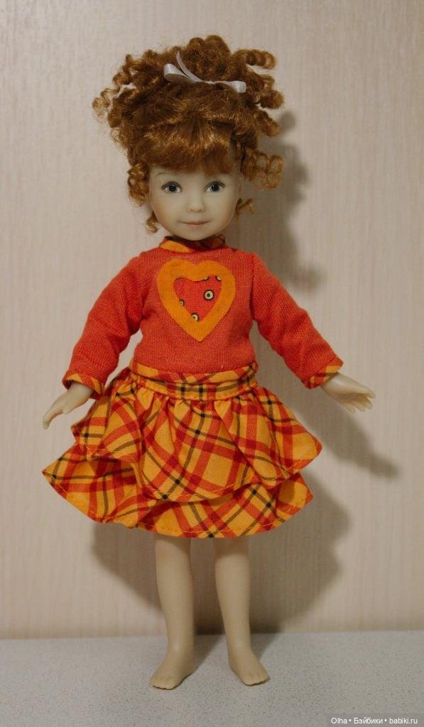 Куколка милейшая до невозможности! В жизни гораздо привлекательней, чем на фото. Аутфит очень качественно сшит, ткани подобраны замечательно. Чего только стоят крохотные цветочки на юбке. Я, честно говоря, такого мелкого принта на ткани никогда в продаже не встречала.