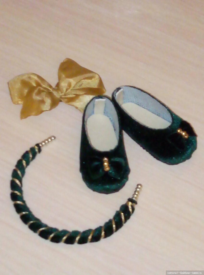 Но мне захотелось добавить винтажных элементов к платью. Бантики с неровными краями из ткани, мягкое хлопковое кружево, моя любимая модель складчатого пояса из золотистой ткани, бархатные зеленые туфельки и бархатный обруч с золотистым плетением, если захочется поменять бантик в волосах.
