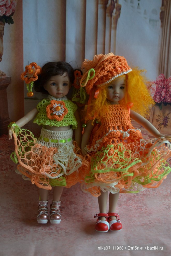 В закромах нашлись туфельки и сапожки, которые им подошли — это порадовало. Ну и платья пока одели из тех, что были, потом что-нибудь свяжу и пошью.