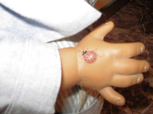 Имя у моей девочки удивительное — Мишели (не путать с Мишель — пусть меня поправят знатоки французского, кажется, ударение должно быть на последний слог ;) ) И образ необычный – девочка с божьей коровкой :) Я так понимаю, «солнышки» сидят на ручках всех деток той давней коллекции «Harmonie»: никакой конкретной информации о ней я, к сожалению, в интернете найти не смогла, зато нашла на том же ибей несколько сестричек моей Мишели: вот и они, явно младшие сестрёнки – моя блондиночка 57см, а они всего по 42, крошки ;)