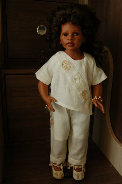 Это девочка ALICIA от автора Elissa Glassgold сделана для также ZAPF в 2002году. Рост 72 см стоя, кукла задумана как сидячая, но у нее проволочный каркас в мягконабивном теле, поэтому при наличии подставки она может стоять. Такая вот экзотическая африканская красавица. Очень красивая кукла!!! Малышка немного загрустила с дороги и очень удивлена, что ее здесь встречают две подружки :D