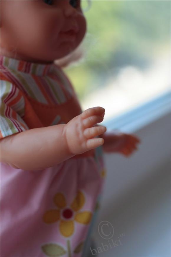 Этой малышке всего 1 годик. Она еще не очень уверенно ходит, поэтому ей нужна поддержка мамы. Чтобы малышка пошла, нужно взять ее за ручки и тихонько потянуть — она пойдет. Работает кукла без батареек, размер 39 см.