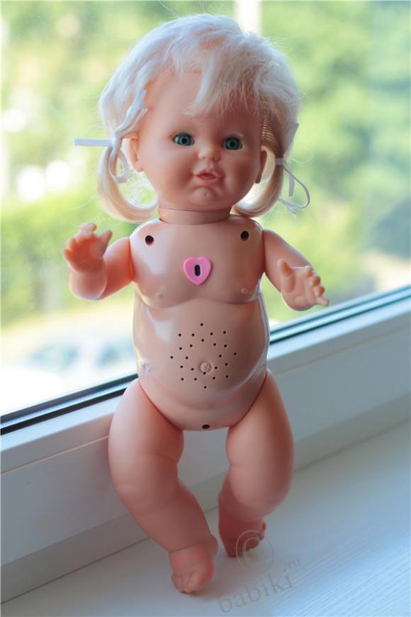 Кукла говорит " ку-ку, ку-ку", " мами, мами чмок-чмок(целует)", «ай-яй-яй», смеётся и во время разговора двигает головой. Реагирует на звук.