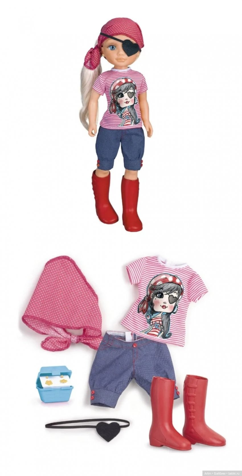 Девочка полностью шарнирная, и ручки, и ножки. А как же, ведь при ее активном образе жизни нужно столько всего успевать сделать! Одета малышка в красные сапожки, джинсовые бриджи, футболку, платок-бандану и, конечно же, в комплект идет повязка на глазик. Повязка чудесно-девочковая, в форме сердечка, и это так мило! Повязку нужно надевать очень аккуратно, чтобы не помять нежные реснички Нэнси.