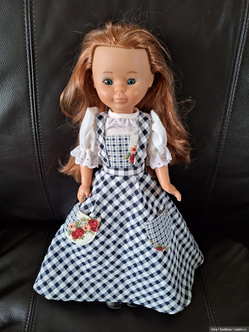 Одежда сшита очень качественно. Швы обработаны, застёжка на липучке. На ногах белые классические туфельки.