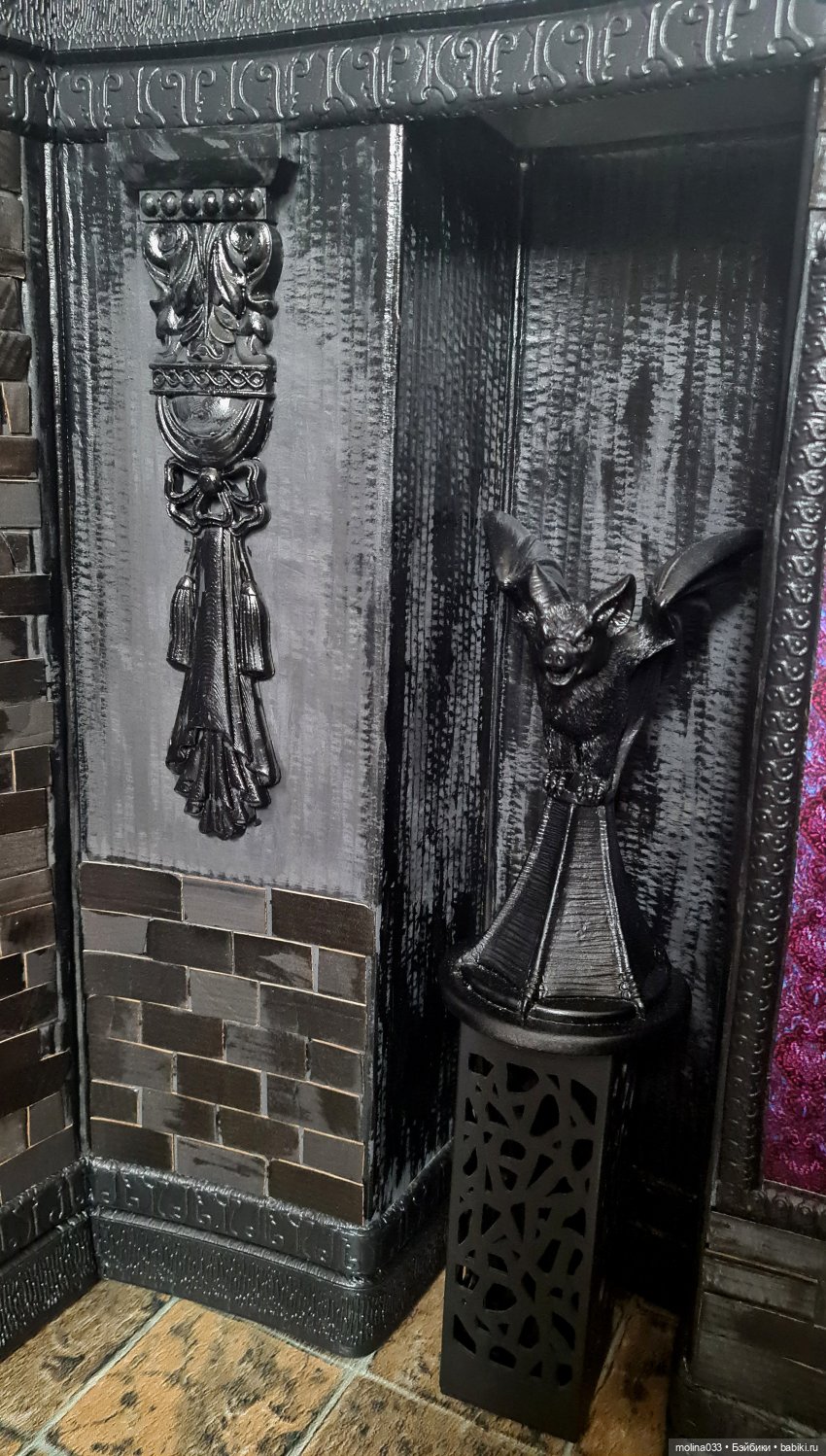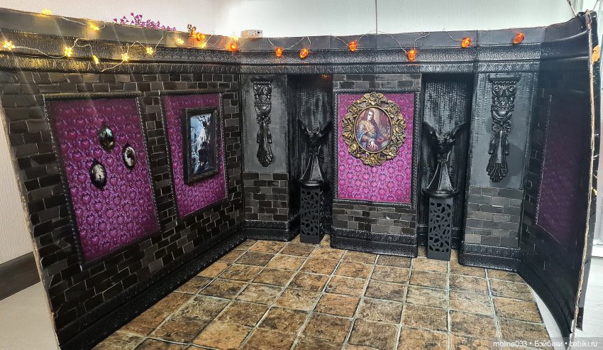 Декорация состоит из длинной картонины, на которой наклеила цветные бумажные листы А4, отделала их багетным самоклеящимся плинтусом, стены «кирпичом» из чёрного картона, покрытого частично лаком, и декоративными элементами с ВБ. В нишах летучие мыши на подставках