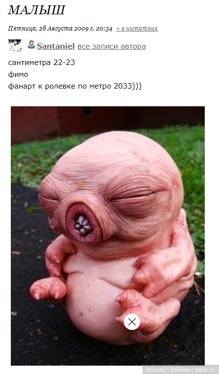 Помогите, пожалуйста, узнать автора этого существа! Куплен инопланетный младенец был на выставке кукол в Воронеже, проходи вшей, ориентировочно, в 2010 году. Стоил очень дорого, но сразил наповал. Сделан из какого-то твёрдого, очевидно бьющегося материала. Сначала был немного липким. Страстно обожаем до сих пор, хотела бы купить ещё какое-нибудь произведение этого автора. Но не знаю кто он. В то время мне это было неважно. Может, кто-то знает? Подскажите, пожалуйста!