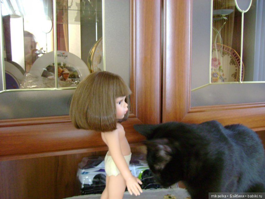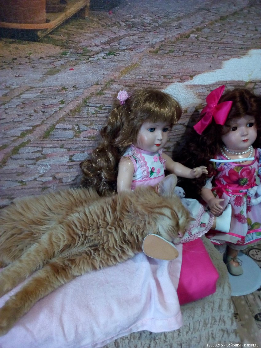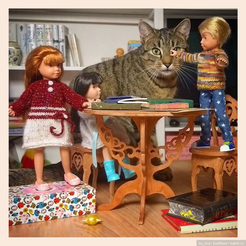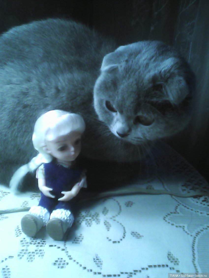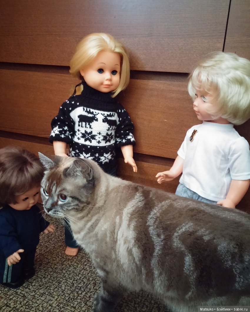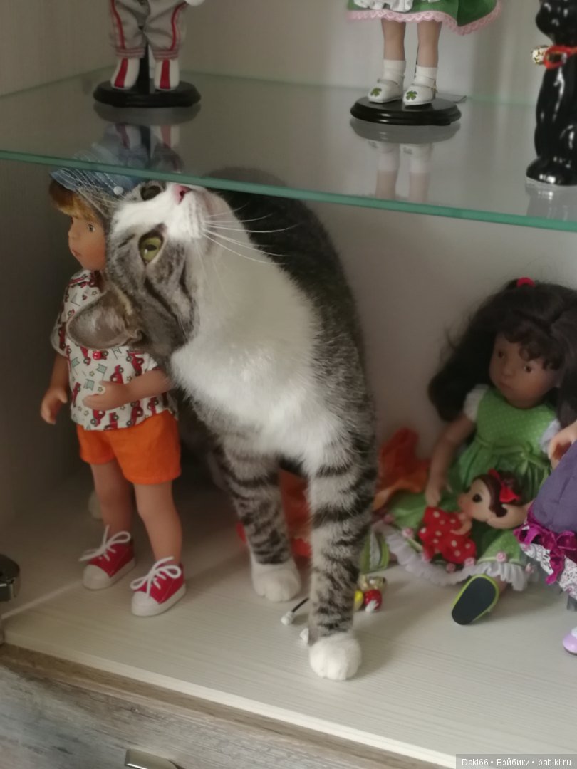 Наш кот скромняга. Но к куклам проявляет интерес. На первый план не вылез, но поприсутствовал.