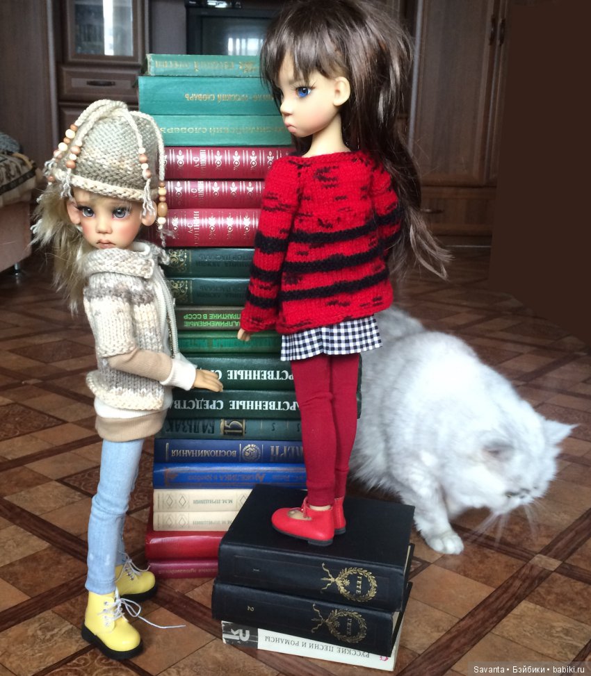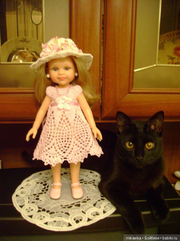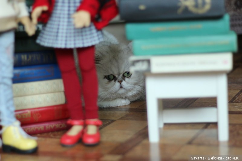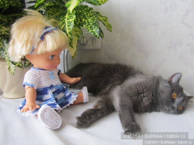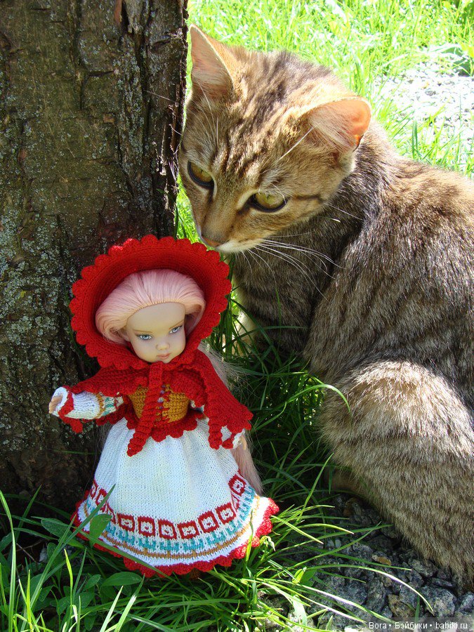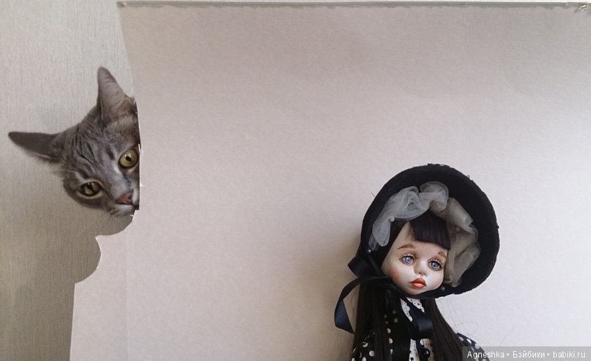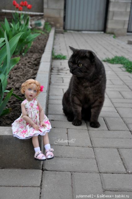 Вася тут как тут. Но она мешает -кукол нюхает, а усы жесткие и куклы от прикосновения усов падают. И поэтому я не разрешаю кошке подходить к куклам во время фотосъемки. Так Васечка тихонько пришла, устроилась рядышком. и тихонько сидела. А потом ей скучно стало и она сама убежала.