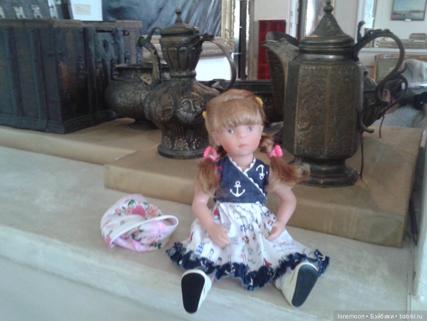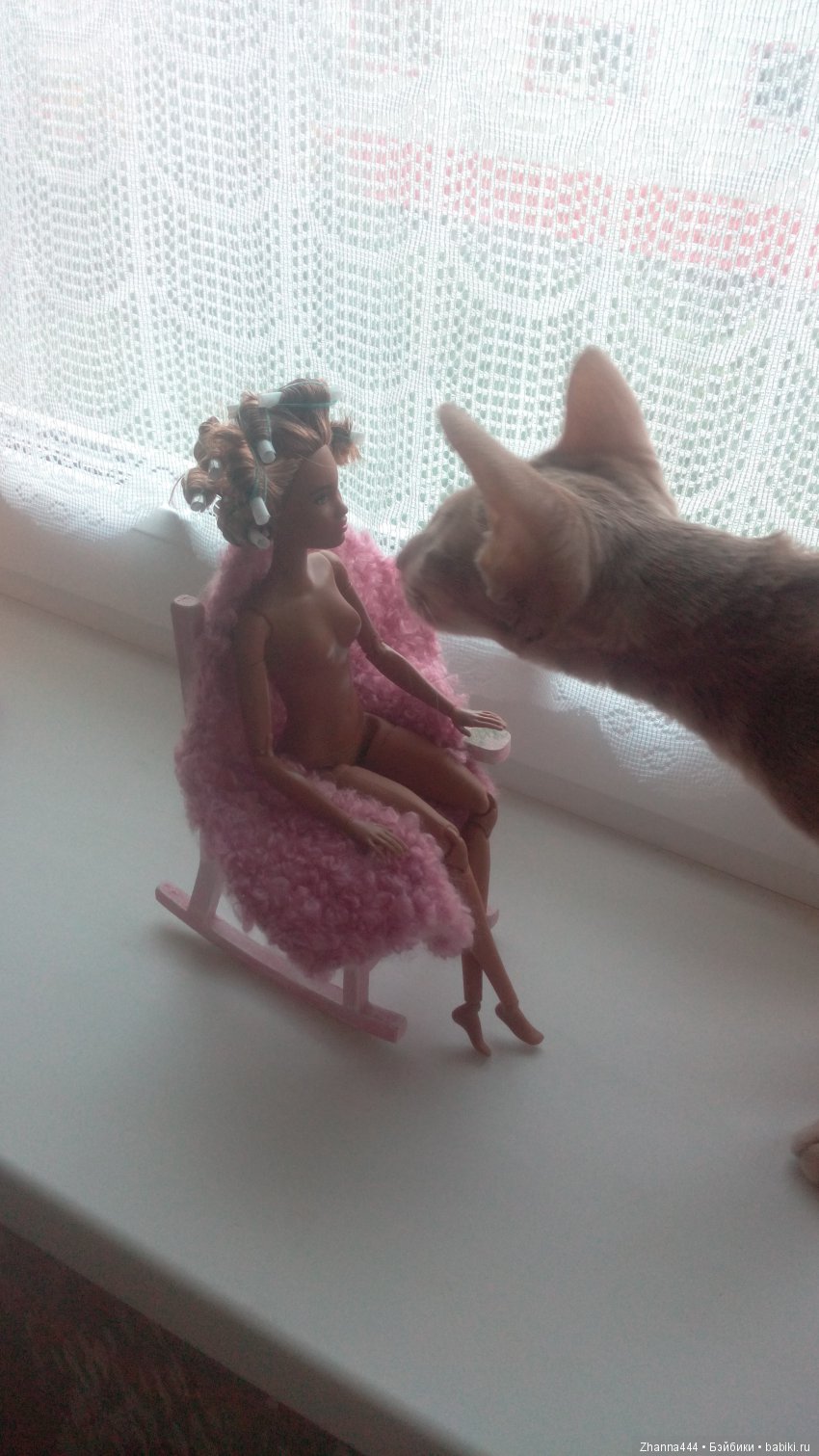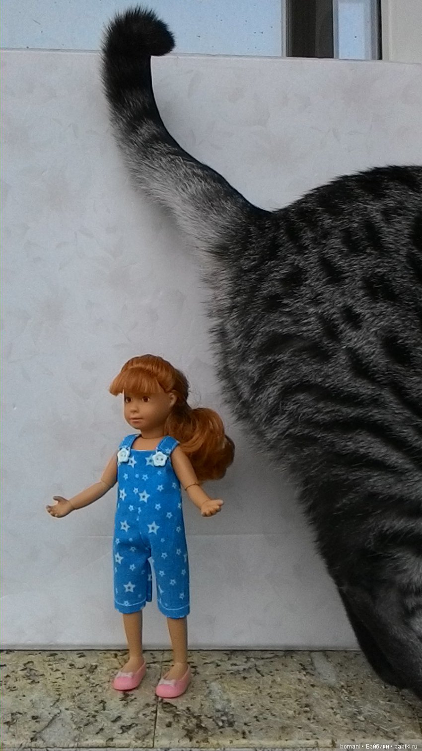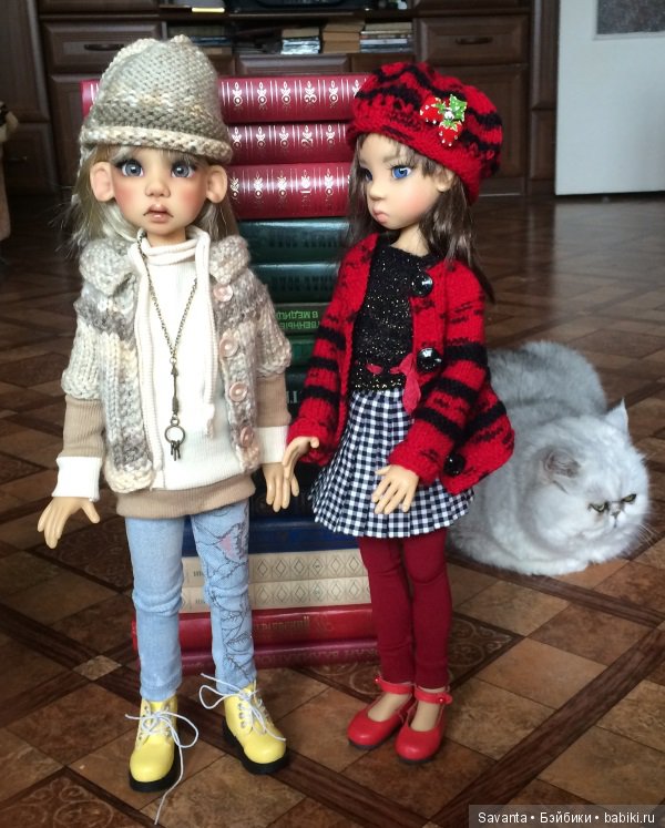 Вася тут как тут. Но она мешает -кукол нюхает, а усы жесткие и куклы от прикосновения усов падают. И поэтому я не разрешаю кошке подходить к куклам во время фотосъемки. Так Васечка тихонько пришла, устроилась рядышком. и тихонько сидела. А потом ей скучно стало и она сама убежала.