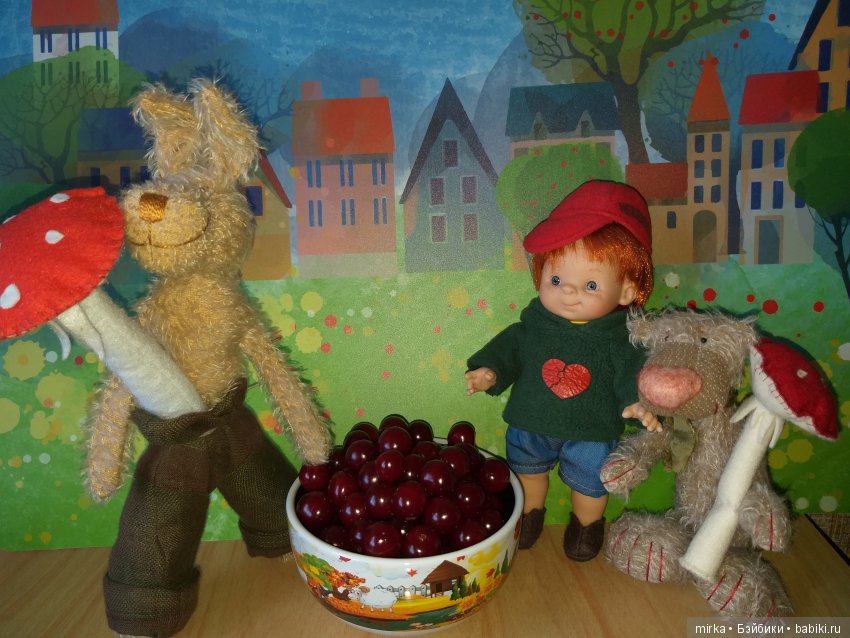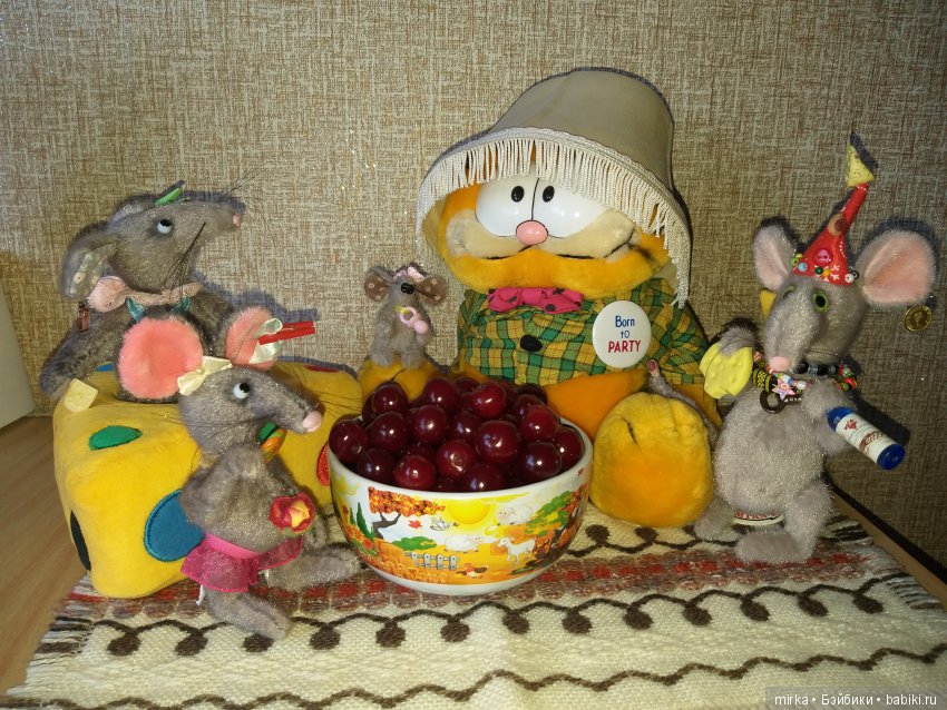 Главное угощение-- вишня, но приглашенные мыши предпочли принести с собой сыр и даже бутерброды на хвосте, чем немало озадачили хозяина, прянявшего абажур за соломенную шляпку… А, может, вишня была уже немного пьяная:)))