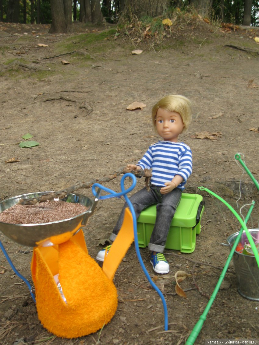 А Миша гречку на костре варит.