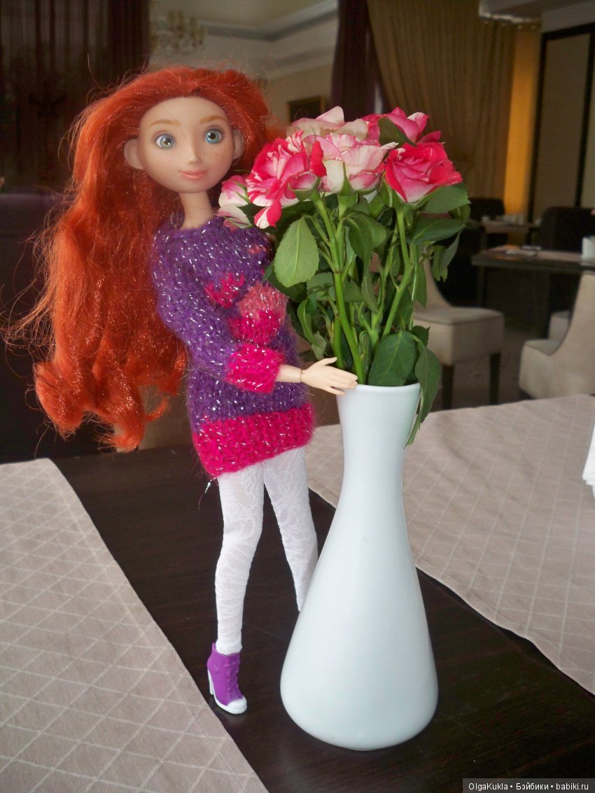У неё есть родной аутфит, но я люблю показывать новеньких обязательно в чем-то что «натворила» сама. С Наташей у нас дело застоприлось на незаконченном вязанном джемпере…