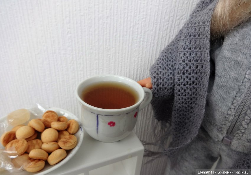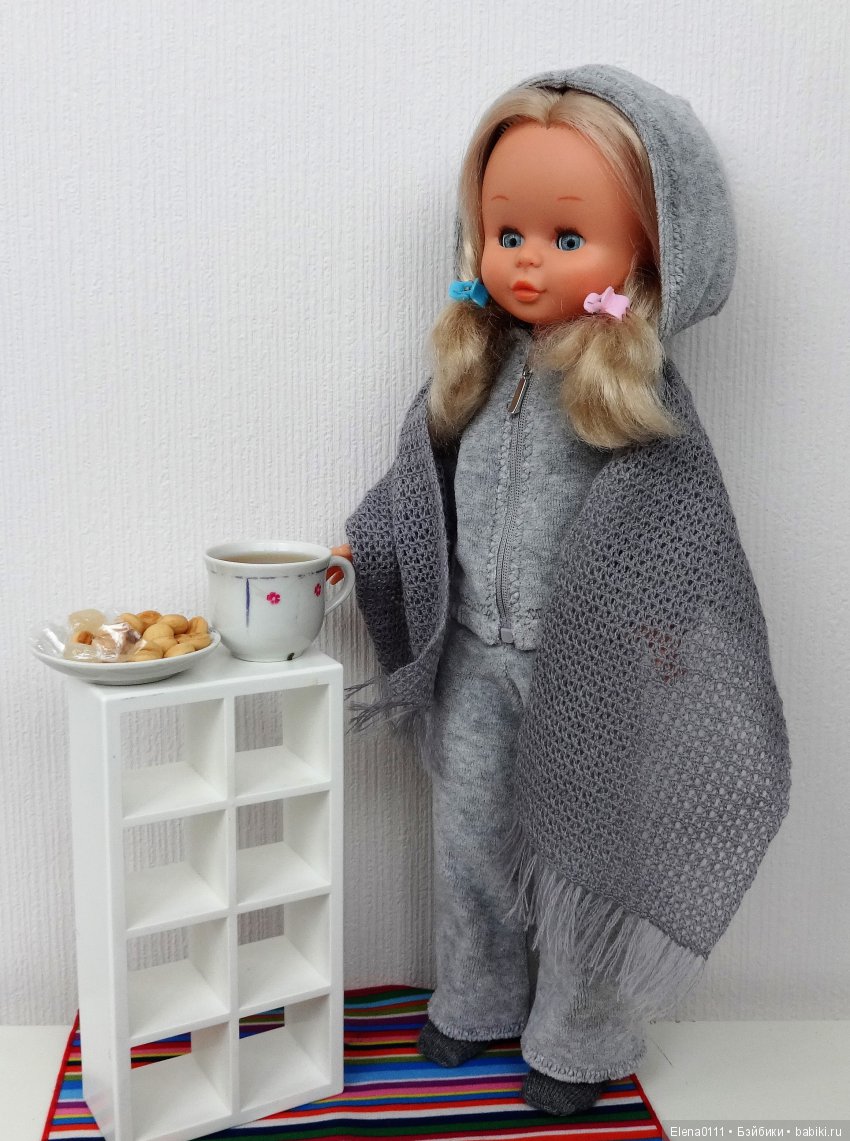 Велюровая кофточка- раз, велюровые брючки-два, шерстяные носочки из мулине в одну нитку-три, палантин из пряжи «Лидия» крючком-четыре!