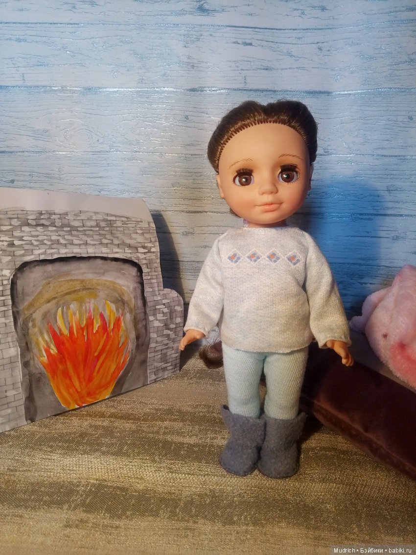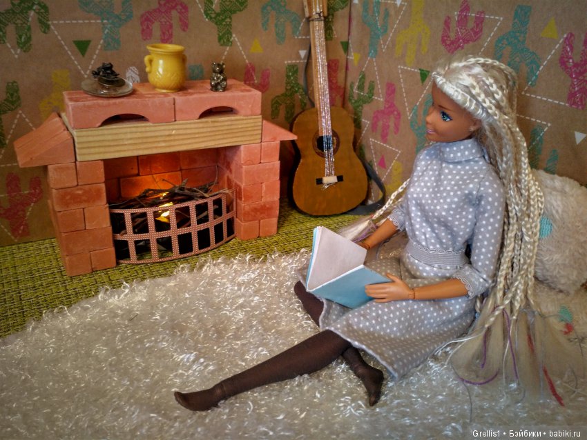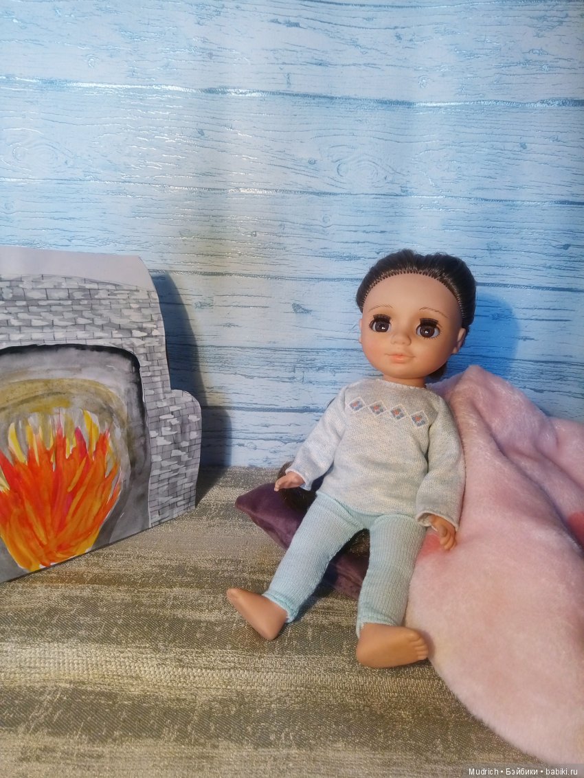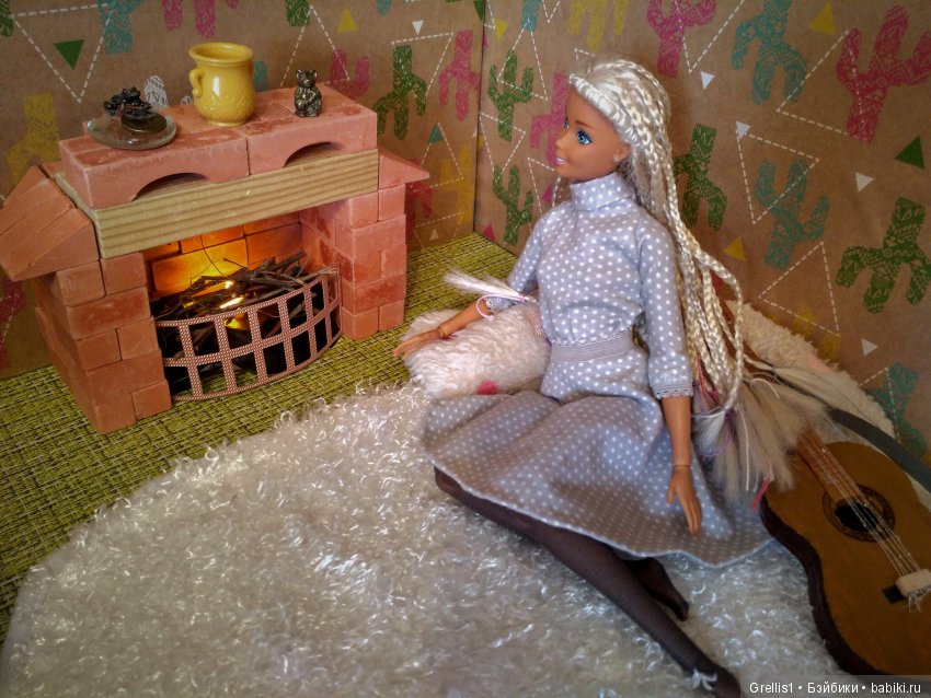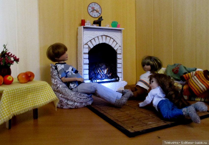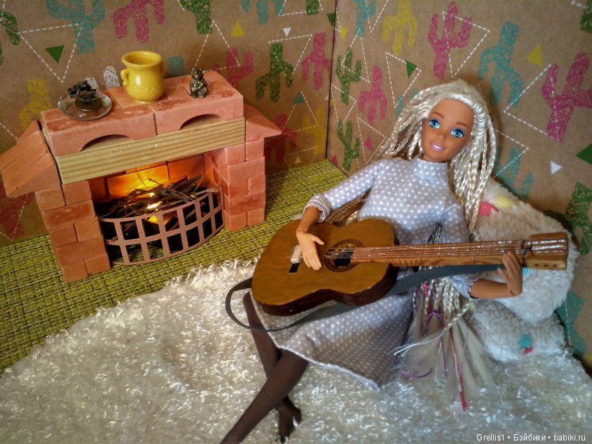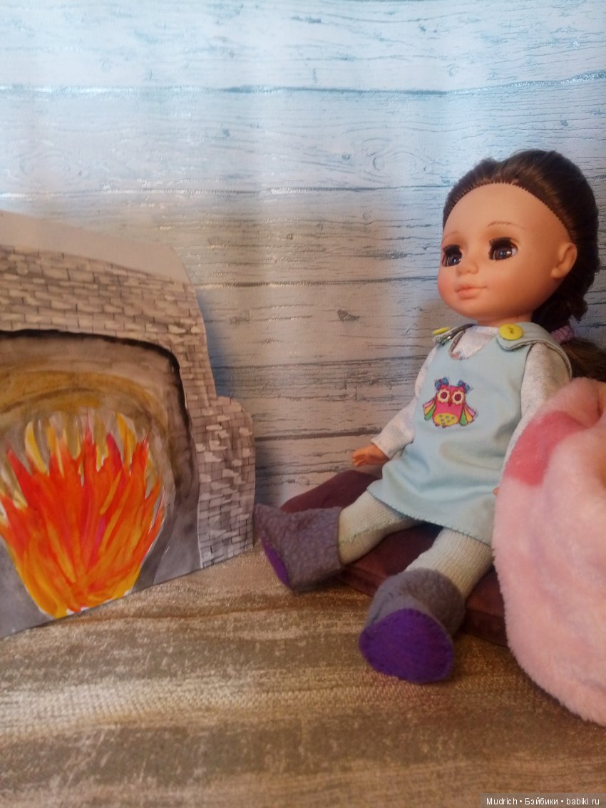 В гости Люба в новом платье. И камин из коробки из под чая и самоклейки. Внутри покрашенные свечки лампочки.