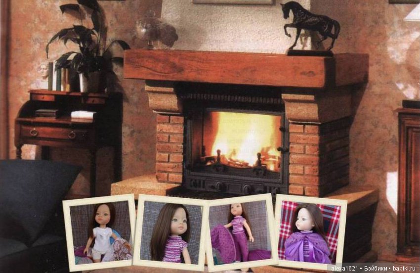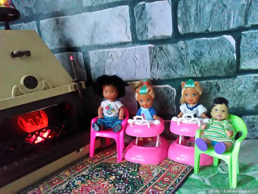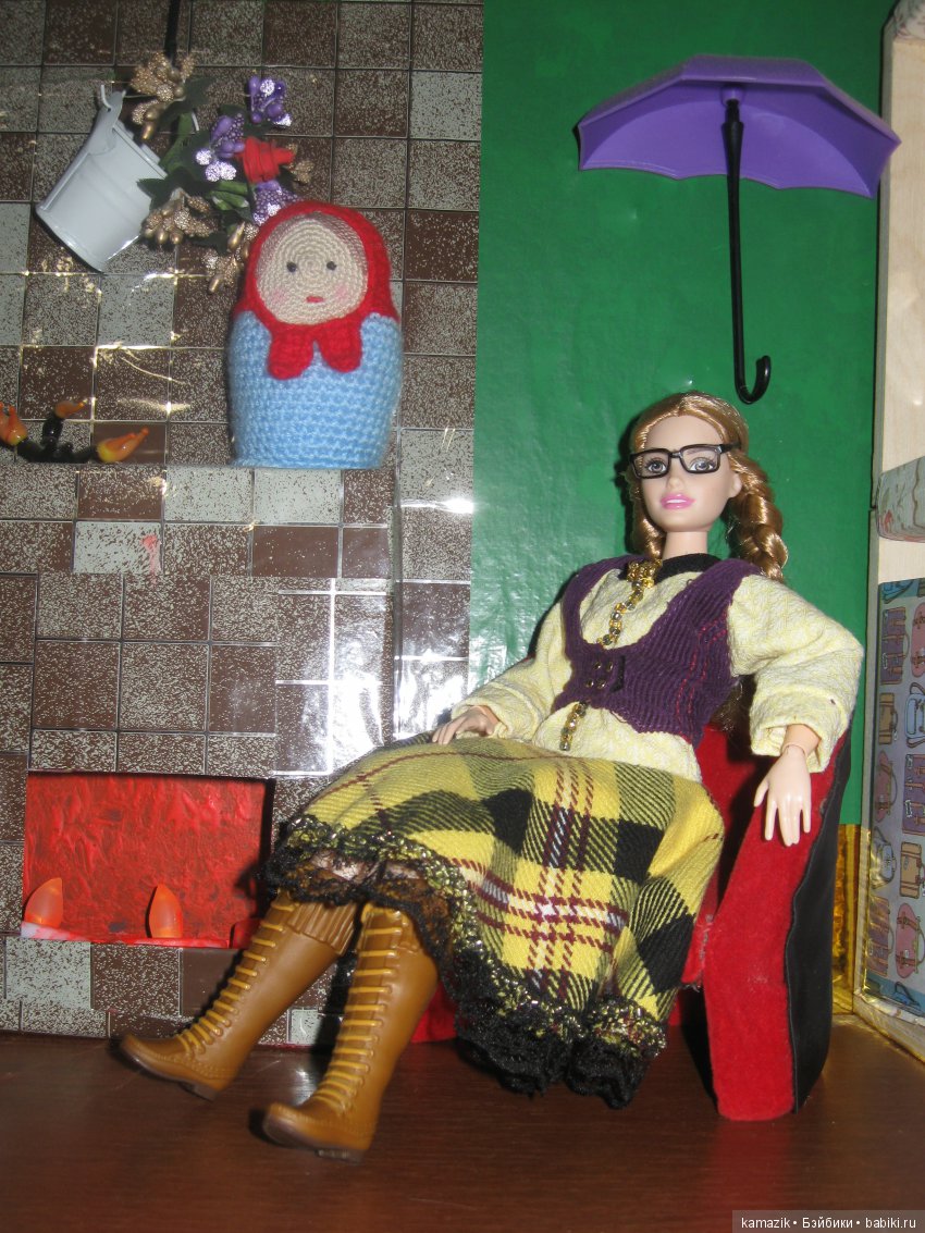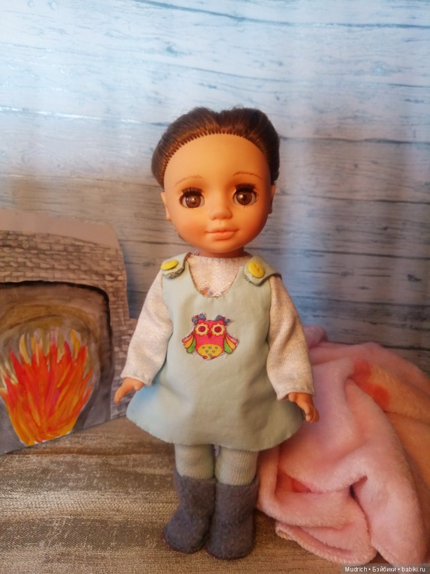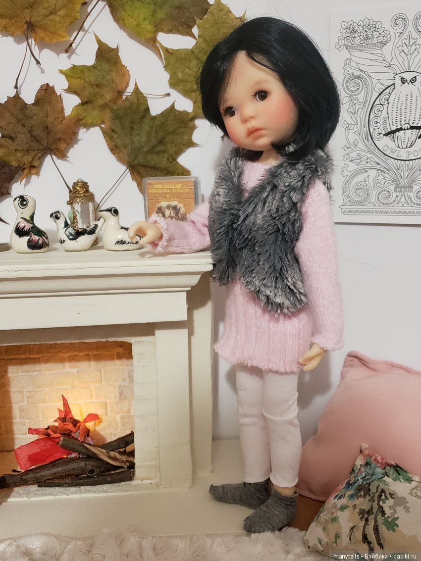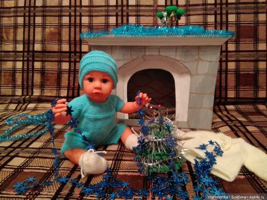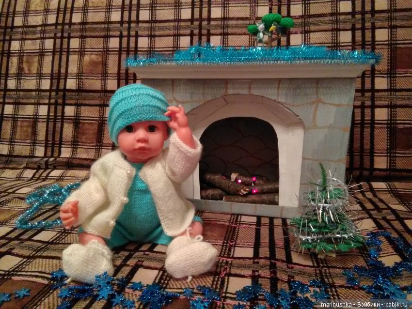 В гости Люба в новом платье. И камин из коробки из под чая и самоклейки. Внутри покрашенные свечки лампочки.