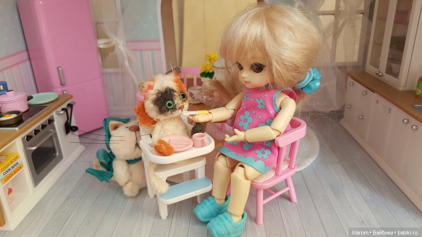 Только моя Ириска не знает куда податься-муж в гостиной перед телеком занял диван, я-кровать в спальной комнате(уложила кукол, протираю полки), а сын в своей комнате разложил на диване вещи-весенний расхомяк! Бедная Ириска бегает по комнате!