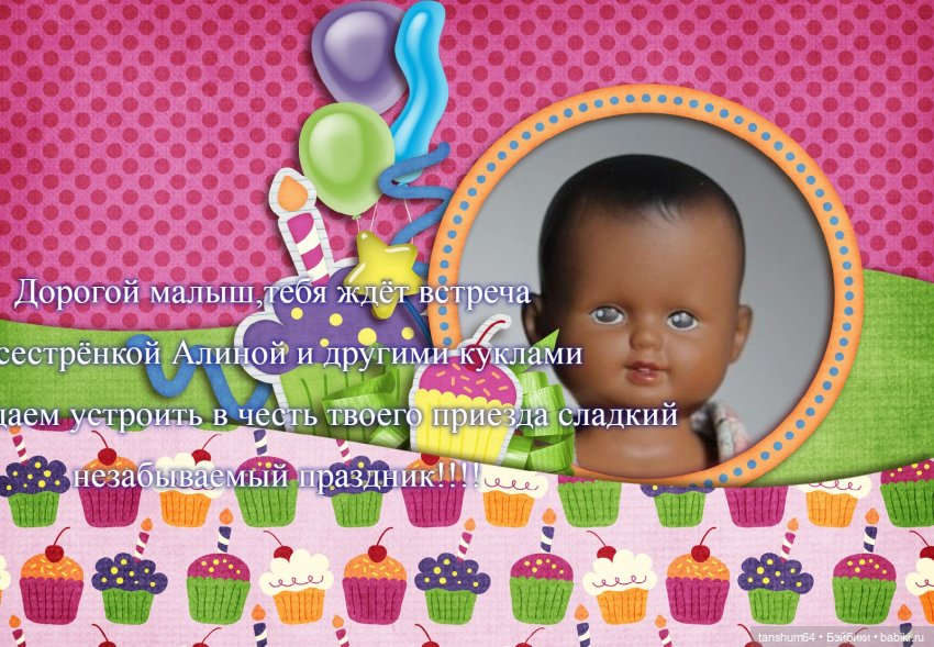 Здравствуй, малышка. Почему-то хочется назвать тебя Иришкой. Приглашаю в гости на постоянное место жительства к моей подруге Ленке. Правда лёгкой жизни не обещаю, но что будет она интересной — факт! У Ленки выдался нелёгкий год и ей просто жизненно необходимы такие друзья, как ты. Которые не будут пускать сопли и лить слёзы в уголке (как я:(), а подарят заряд энергии и всегда будут радовать и веселить. Потому что, глядя на такие чудесные ямочки и озорную улыбку, просто нельзя не улыбнуться в ответ. Ленка верит в чудеса и упорно пытается выиграть куклу, но пока ей это не удаётся. Но она не унывает. Не в этот раз, так в следующий. Представляешь как она удивится и обрадуется, если ты приедешь к ней в гости?! Это будет настоящим чудом! А ещё моя подруга очень верная. Она тебя никогда не продаст. Ленка очень любит свою маленькую и разношёрстную компанию кукольных товарищей. И они, конечно же, тоже будут с тобой дружить. Приглашаю тебя стать лучиком надежды и ангелом-хранителем для Ленки. С уважением, Наташка.