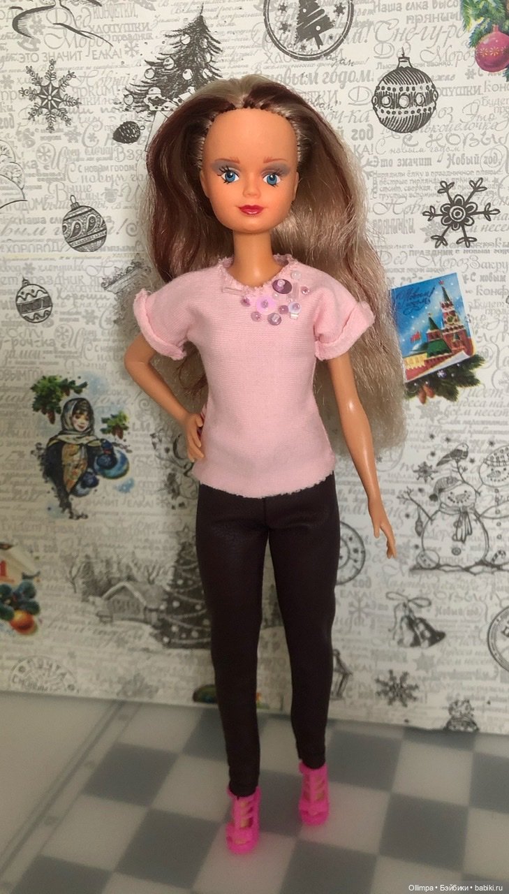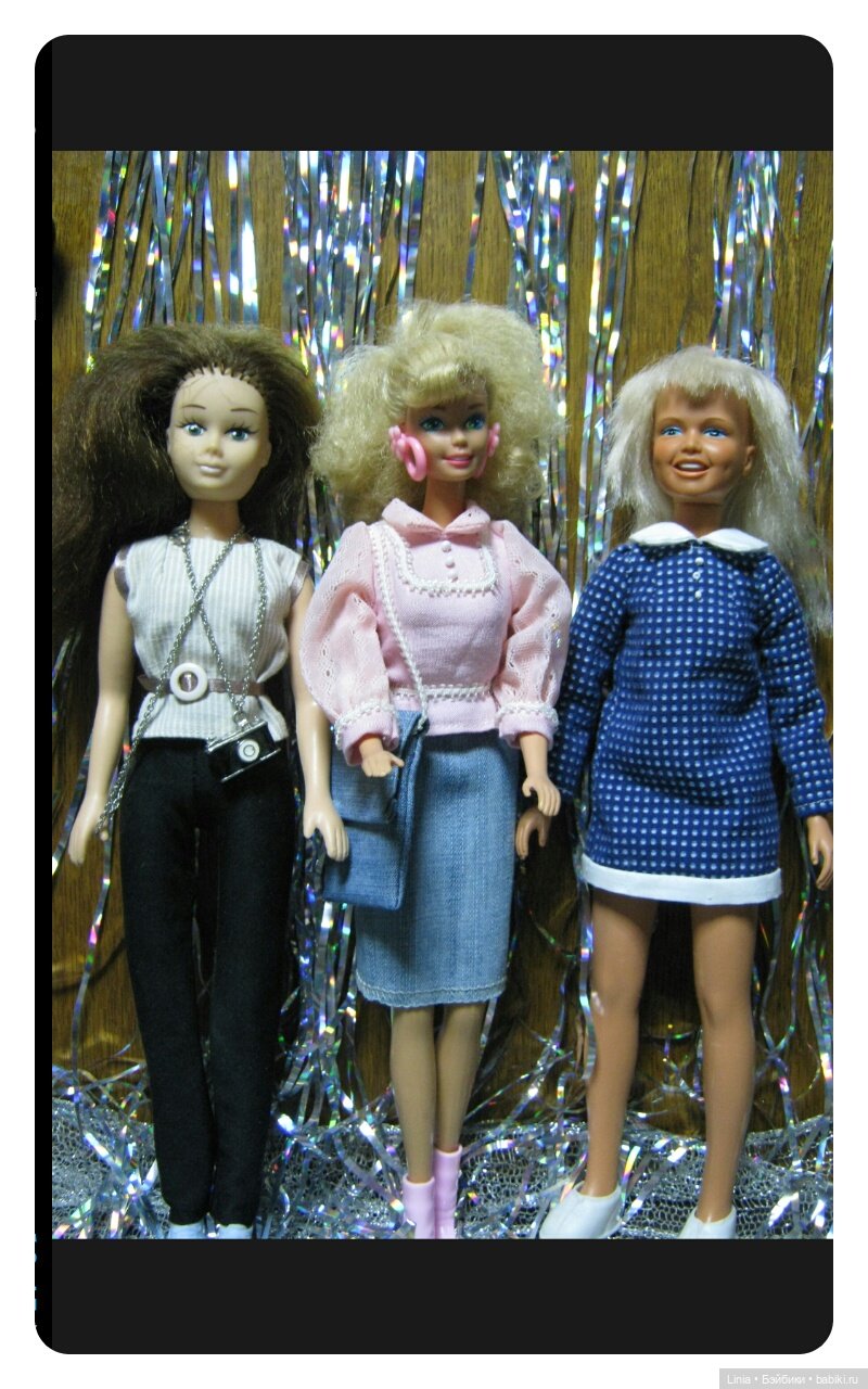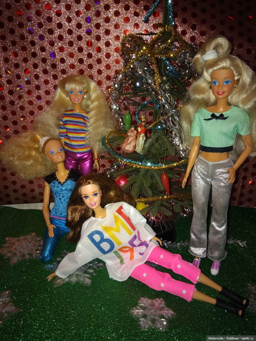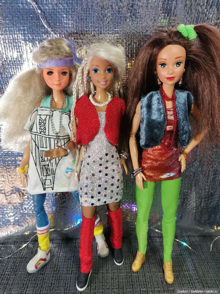 В полосатой кофточке и на миниатюрном теле — Кристаль (Earring Magic Barbie (blonde) 1992), рядом с ней в синем — Пиппа (Barbie And The Rockers 1986), отжала кофточку у БМР Катрин (Pioneer Barbie 1995). И еще — в серебристых штанах — Мартина (Summit Barbie 1990).