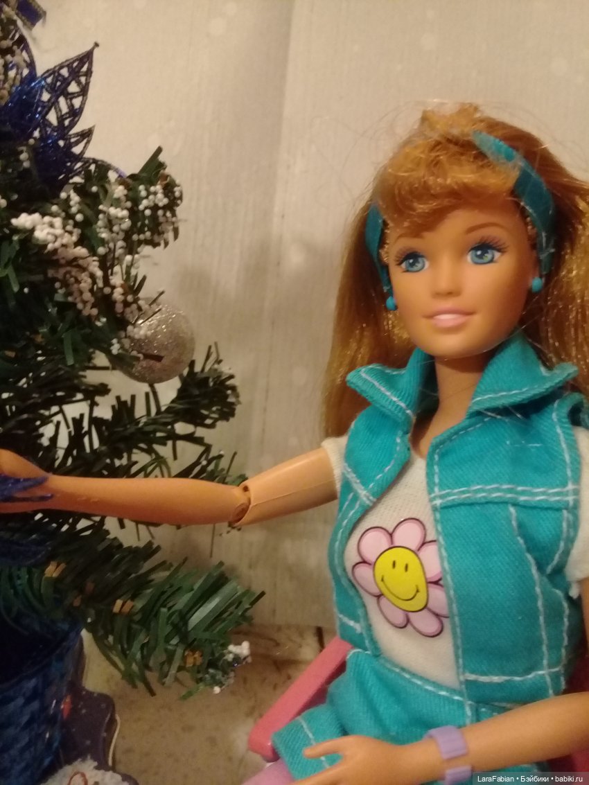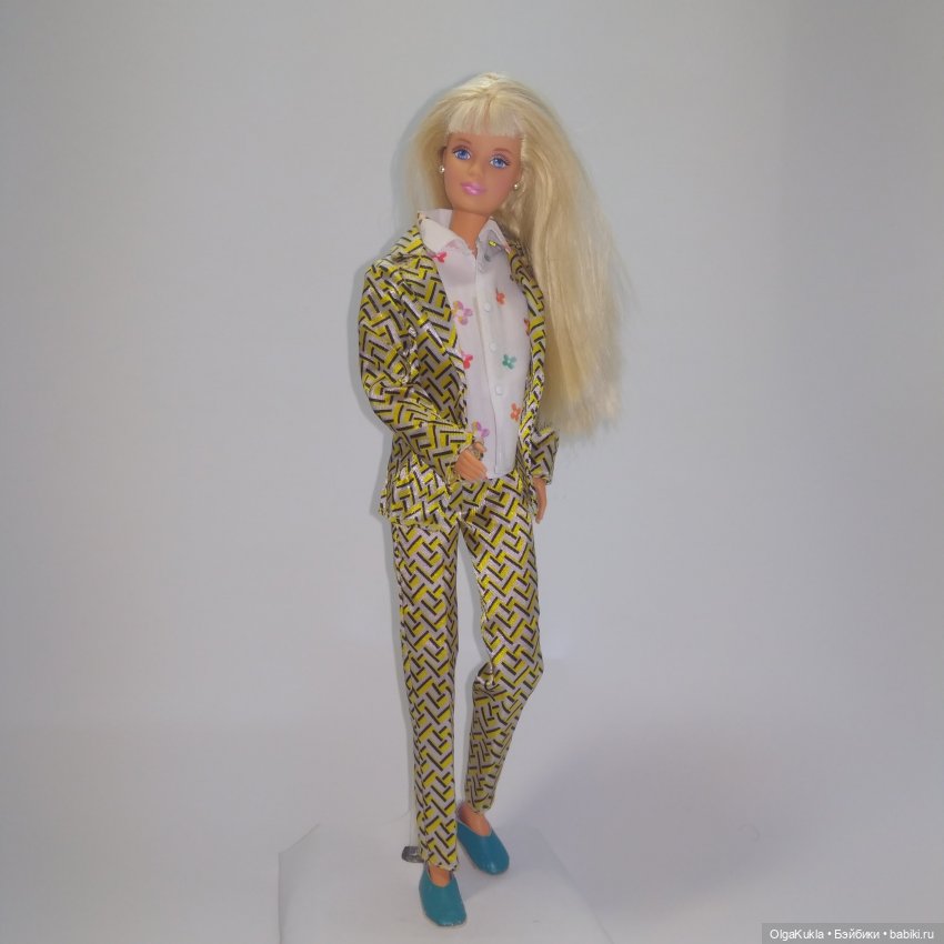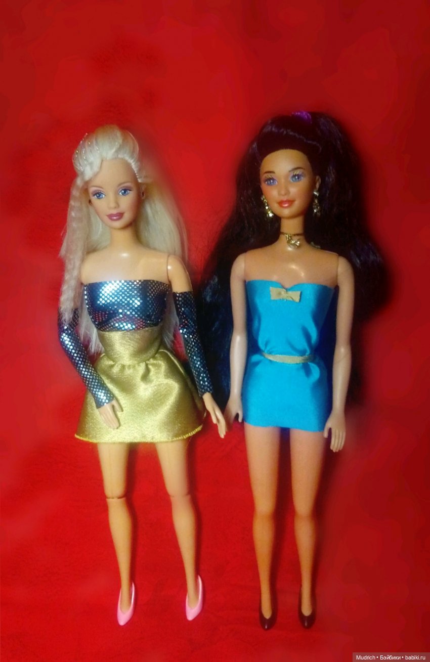 В полосатой кофточке и на миниатюрном теле — Кристаль (Earring Magic Barbie (blonde) 1992), рядом с ней в синем — Пиппа (Barbie And The Rockers 1986), отжала кофточку у БМР Катрин (Pioneer Barbie 1995). И еще — в серебристых штанах — Мартина (Summit Barbie 1990).