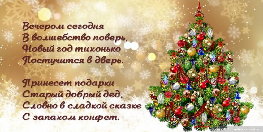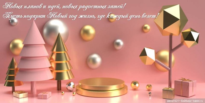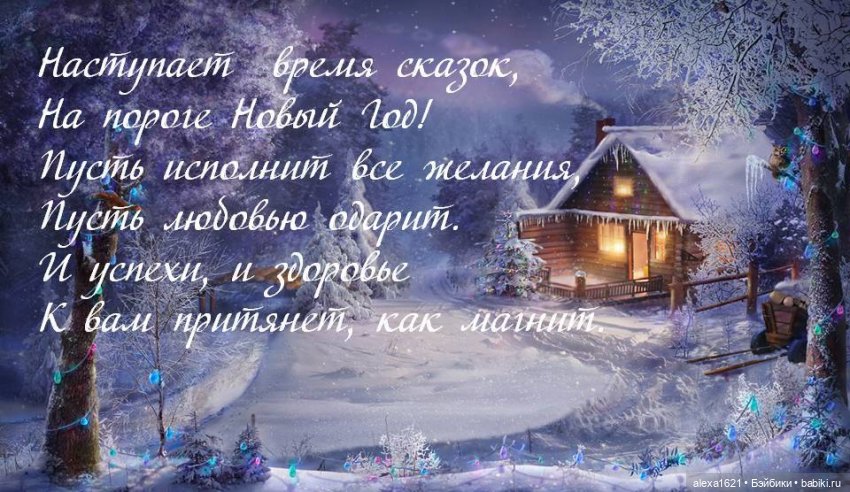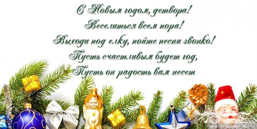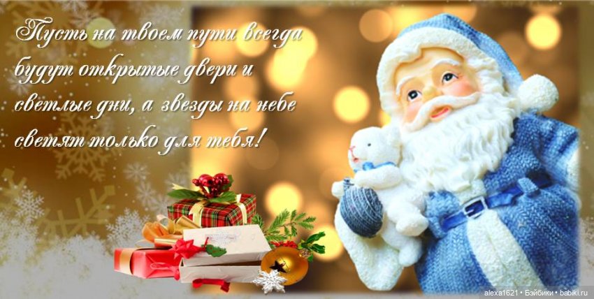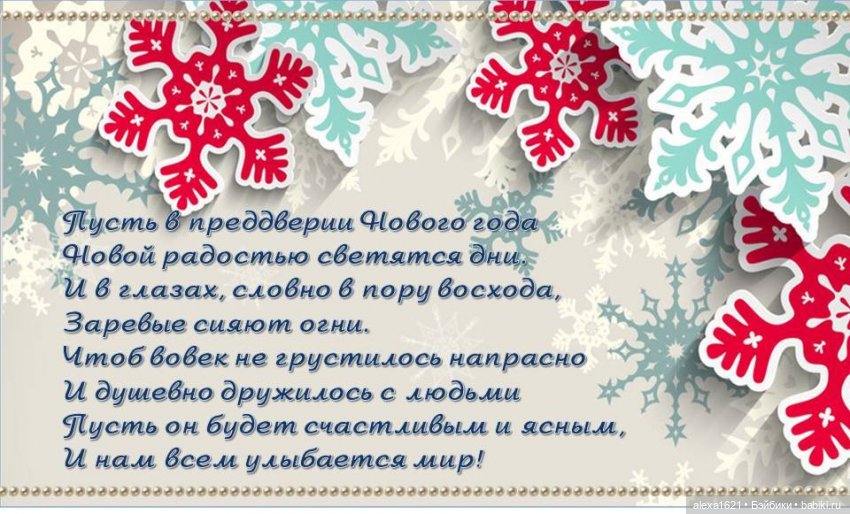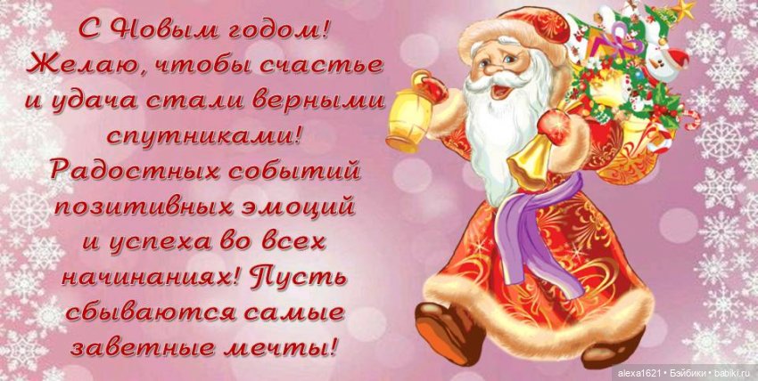 Поздравляю с Новым годом! Желаю, чтобы в будущем году каждый день дарил нам улыбку и частичку добра. Пусть всё, что мы планировали, обязательно сбудется: всё то, что хотели начать, — начнется, а что хотели закончить — закончится. Пусть в следующем году мы все станем счастливее, добрее и внимательнее к окружающим нас людям, а мир откроет нам новые двери!
