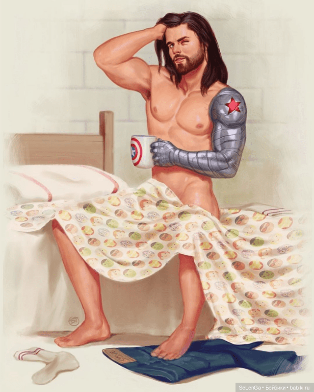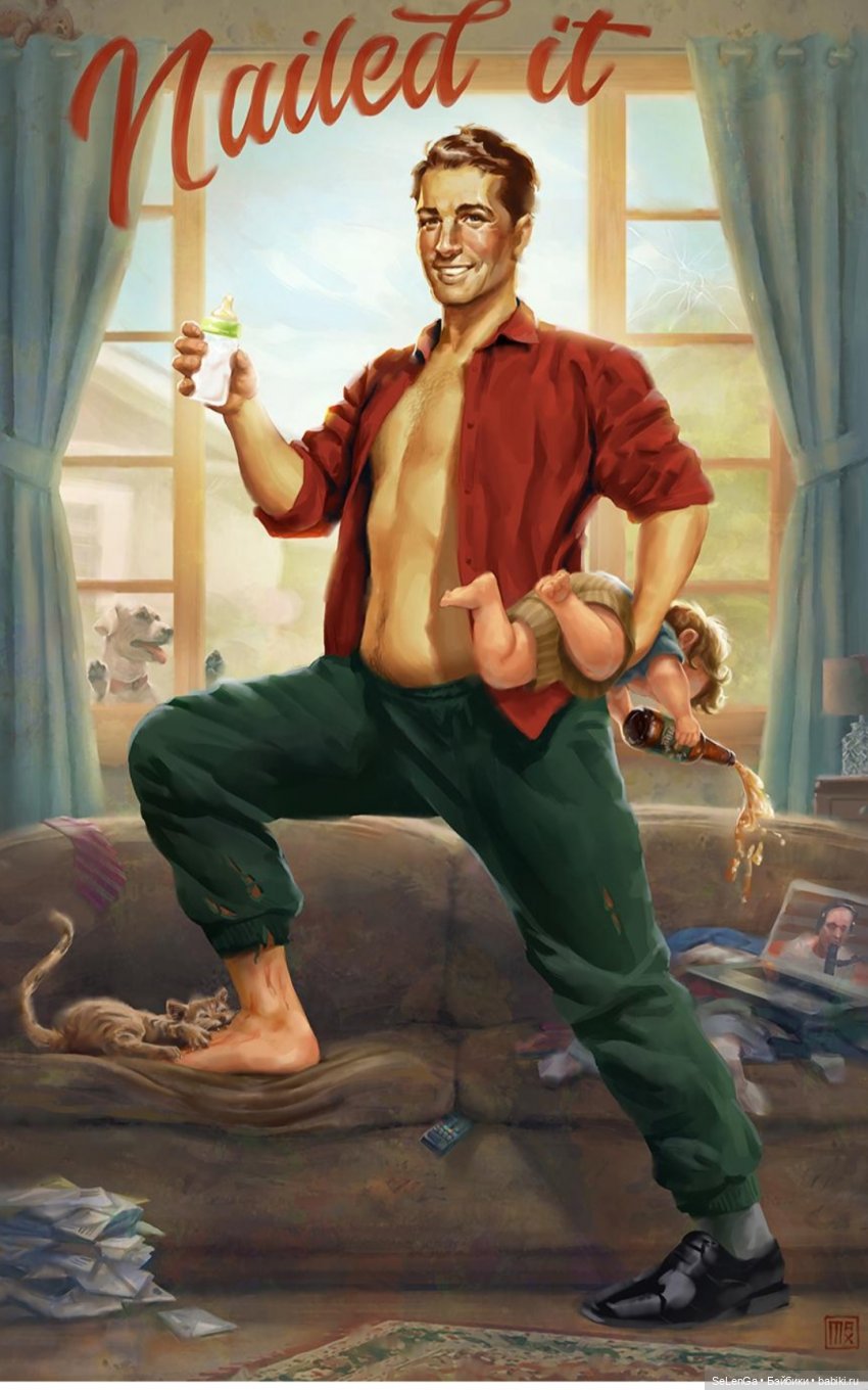 3. 🌶️Брутальные мужчины занимаются брутальными делами, но делают это гипертрофированно по женски, с мимикой или жестами, как у девочек-девочек. Здесь же: пародия на женскую объективированность и сексуализацию: вместо юбки — ветром поднимается мужской халат, вместо лопнувшей резинки на трусиках — спущенные джинсы на попе, или полотенце, соблазнительно зацепившееся за гвоздь).