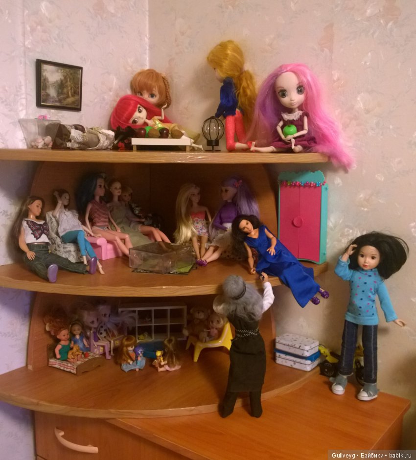 PS У меня наконец-то часть кукол получила свое место) Это еще временный вариант, будет дополняться всё, буду еще полочки делать. Но пока так))