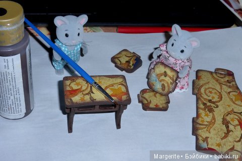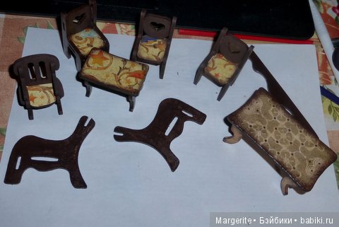 На самом деле, тут все очень просто: на сиденья и столешницы разбавленным клеем ПВА наклеена та самая упаковочная бумага, просушена под прессом. Затемненные края «прочпокала» губкой с краской (губка обычная для посуды, я просто ее нарезала поперек полосами по полтора-два сантиметра). Каркас покрашен акриловой краской. Ну, и лак акриловый в 2-3 слоя… :)