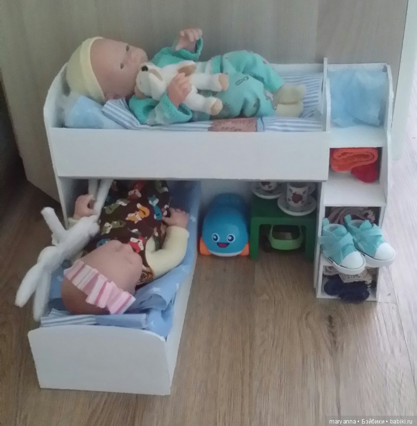 Но уже есть где спать малышам. Я им сделала двухъярусную угловую кроватку из пенокартона.