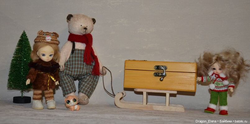 Помогает девчонкам настоящий полярный мишка Олаф. Он все тропинки знает, да и сильный, много унести может. Ну и Фаня от девочек ни на шаг не отходит, маленькая, но очень энергичная. Снежана одела костюм медвежонка, хочет дополнительный подарок за костюм получить)