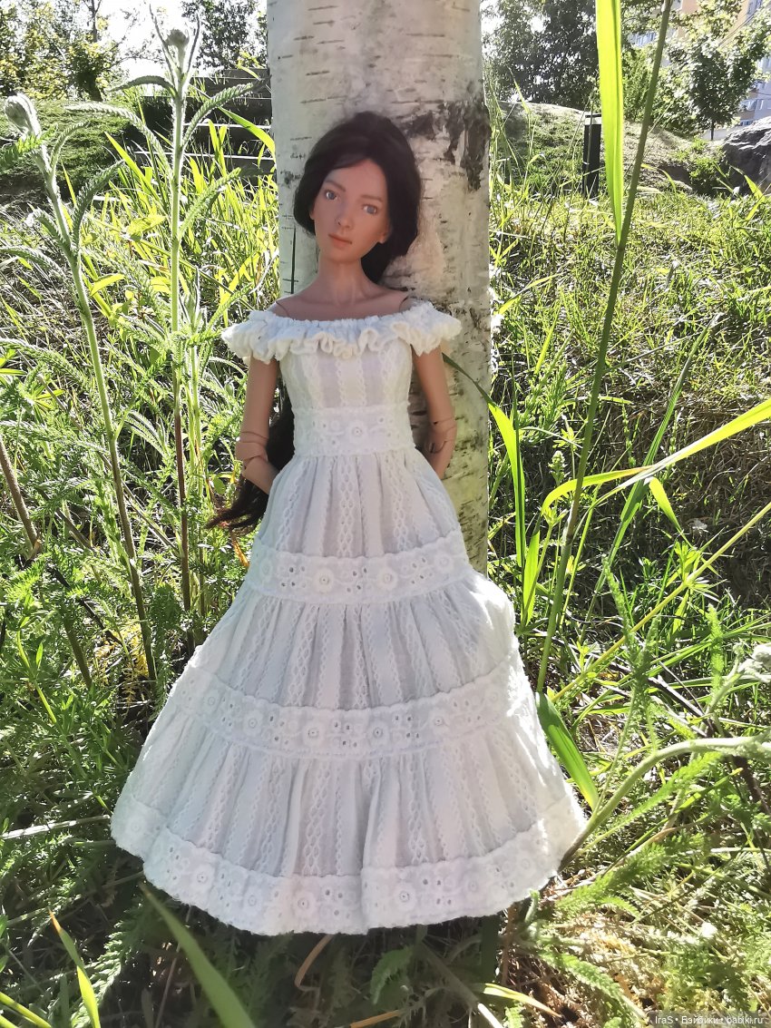 Я его сшила из батиста с эффектом крэш, он как будто мятый и бугристый, поэтому на кукле смотрится как домотканный. Отделка — ручная набойка и машинная вышивка. Верх на подкладке, сзади платье застегивается на пуговицы.