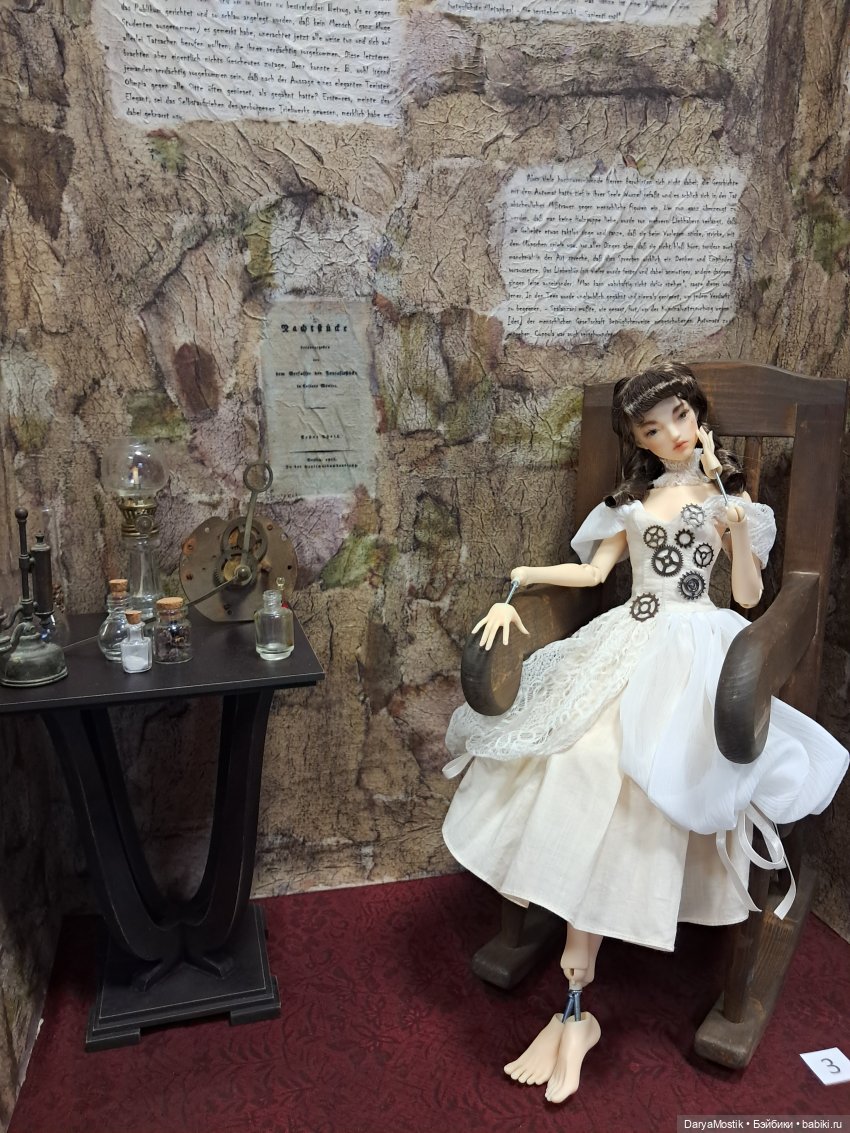 Моя композиция на выставке-ярмарке у Ми(ф/р)отворцев по мотивам новеллы Э.Т.А. Гофмана «Песочный человек». Романтический юноша Натанаэль влюбился в прекрасную Олимпию, и особенно его покорило то, что она прилежно выслушивала его стихотворения и повести и никогда ничего не говорила, кроме «Ах-ах», не вязала, не глядела в окно, не играла с собачкой, не зевала… Но в итоге выяснилось, что Олимпия – лишь заводная кукла. Натанаэль сошел с ума, а в обществе были приняты меры, чтобы избежать в дальнейшем подобного подлога. Многие юноши, дабы удостовериться, что они пленены не механической куклой, требовали от своих возлюбленных, чтобы они во время чтения вязали, глядели в окно, играли с собачкой, зевали и даже иногда говорили бы сами.