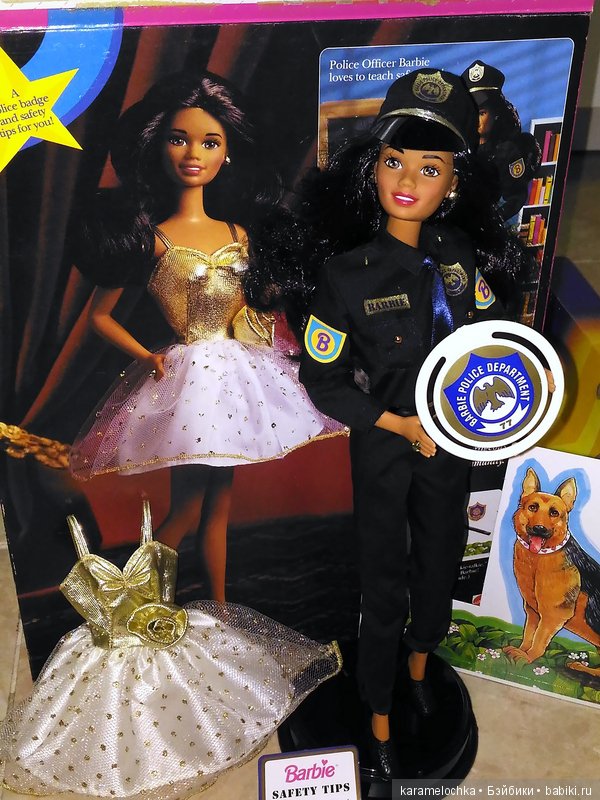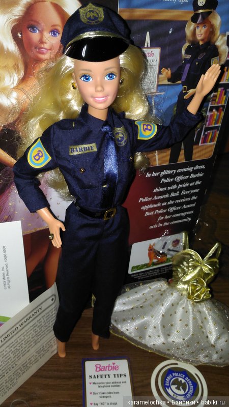 А полицейская форма — это их родной аутфит: эти куколки — это The Carieer Collection Police Officer Барби и Кристи, 1993 года выпуска. В комплекте у каждой из них — два наряда: полицейская форма с черными ботиночками и вечернее платье с белыми туфельками.