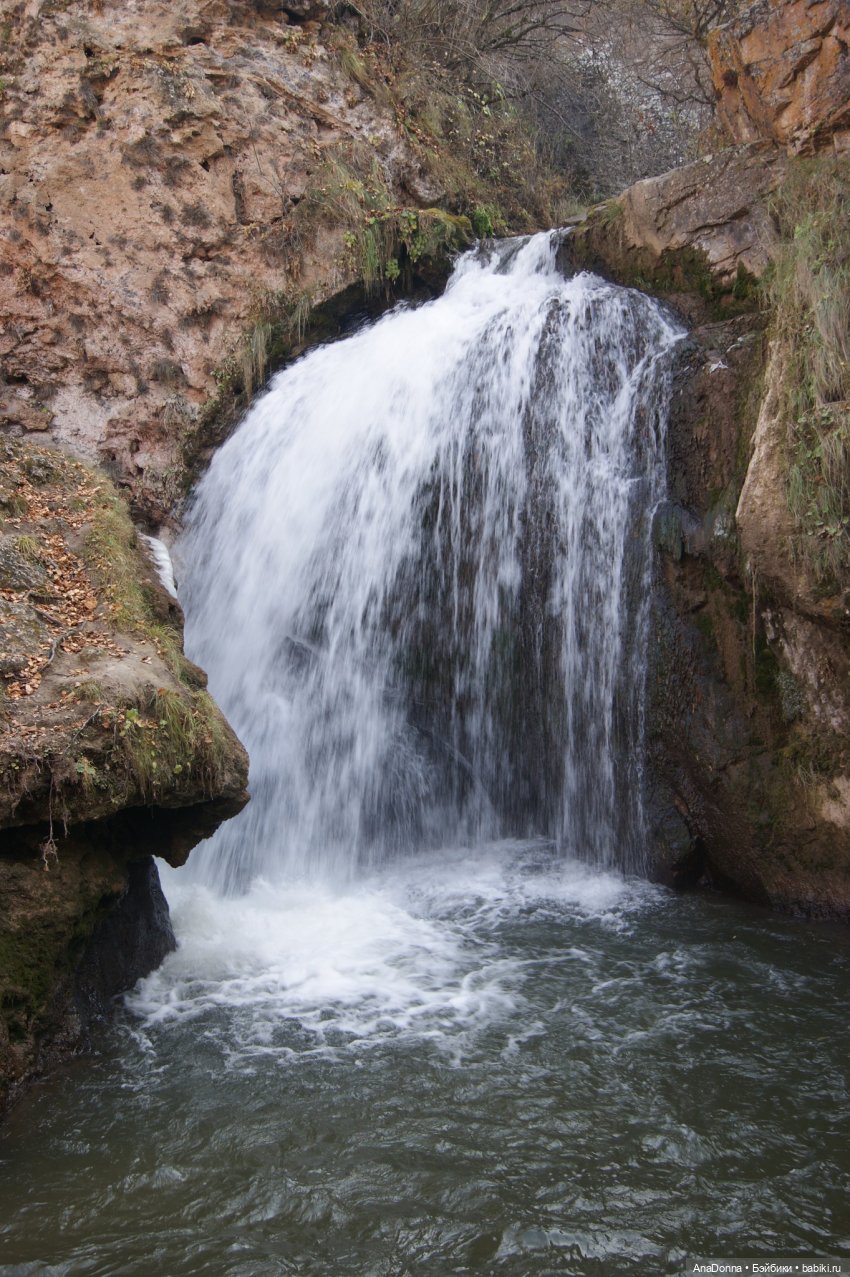 Вот мы и подошли к главному водопаду всего комплекса: с высоты 18 метров в Аликоновку впадает речка Эчки-Баш (Козья голова). Именно под Большим медовым туристы частенько устраивают настоящие фотосессии, местные предприниматели предлагают фото на лошадях. А напротив расположилась уютная ниша со скамейкой, где можно сидеть часами, наблюдая за игрой света и тени на хрустальных нитях воды.