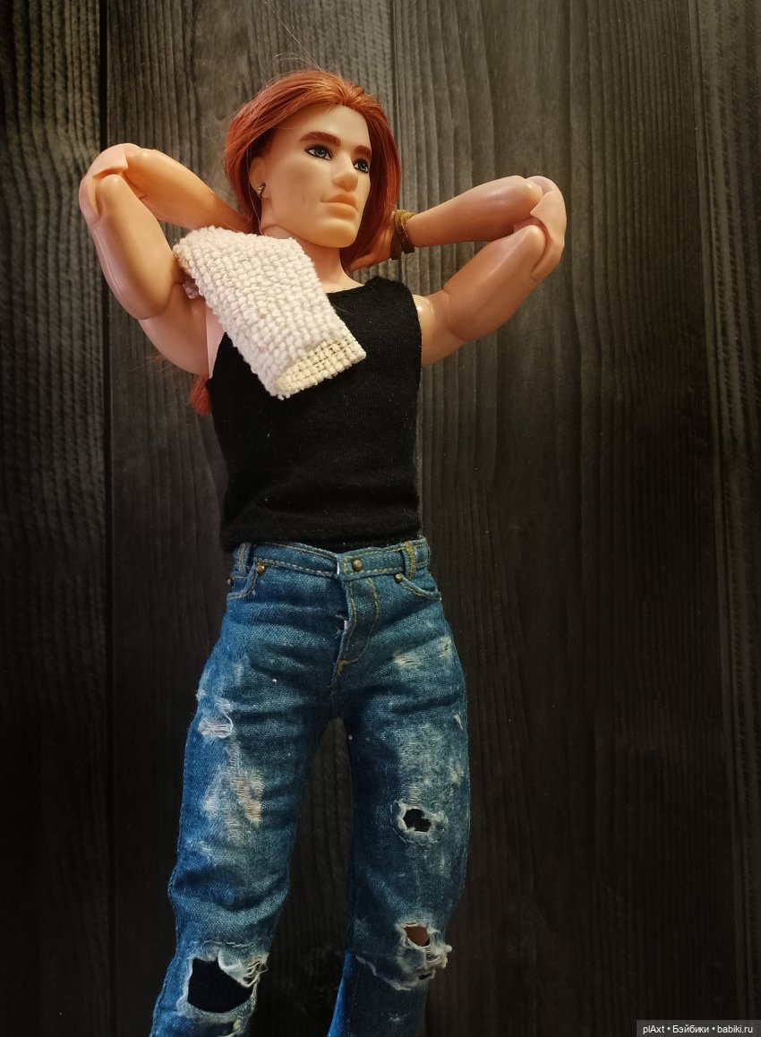 Чёрная майка обтягивала торс, подчеркивая мужской рельеф и эффектно выделяя плечи. Парень видимо ходил умываться: на лице осталось пару капель и тонкая прядка огненных волос прилипла ко лбу. Остальная грива была убрана в немного растрёпанный хвост.