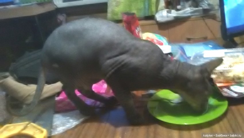 облизыватьмыть посуду.кот почти без шерсти Васька.