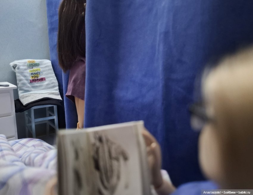 И оба такие аккуратисты: вещи сложены на стульчике и на стойке, Уля перенимает привычки Миши ;)