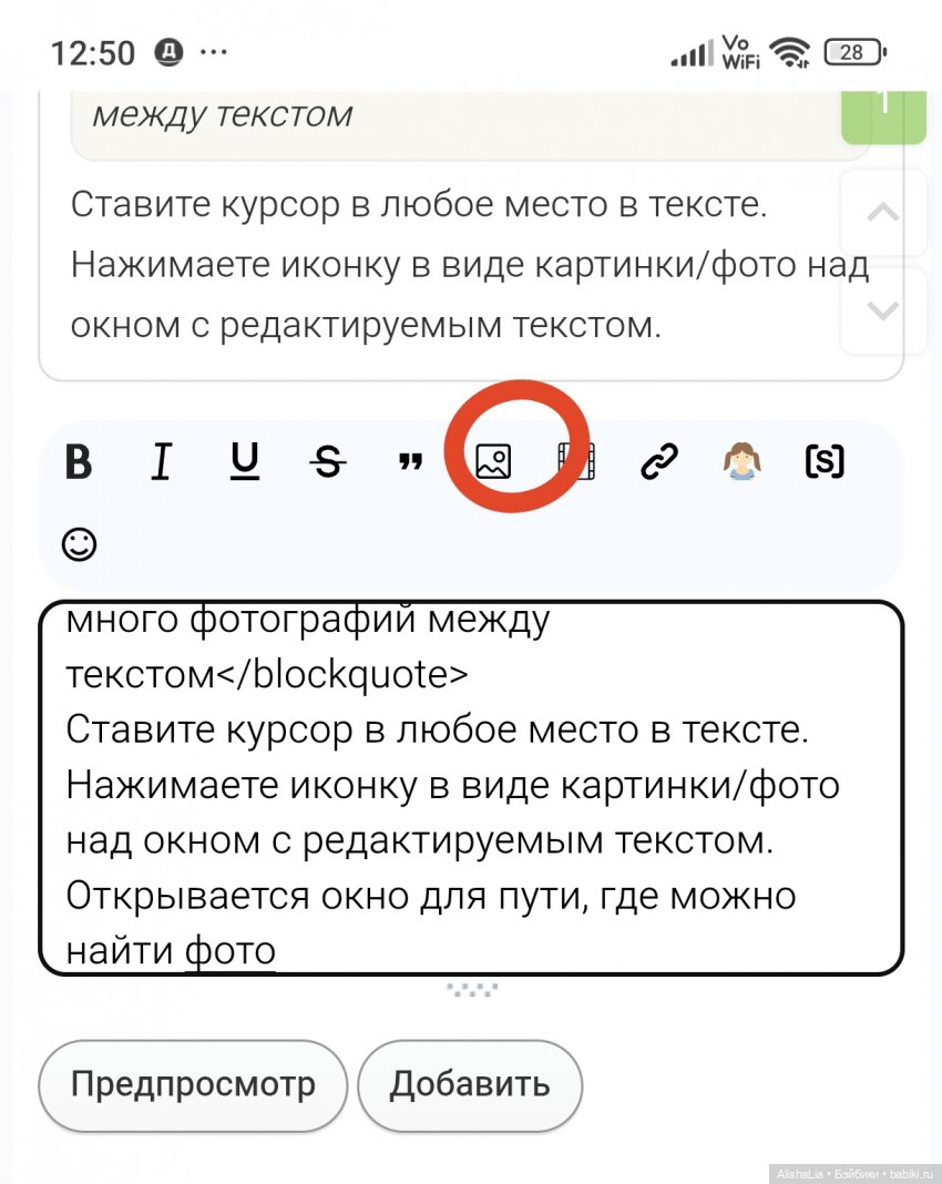 Ставите курсор в любое место в тексте. Нажимаете иконку в виде картинки/фото над окном с редактируемым текстом.