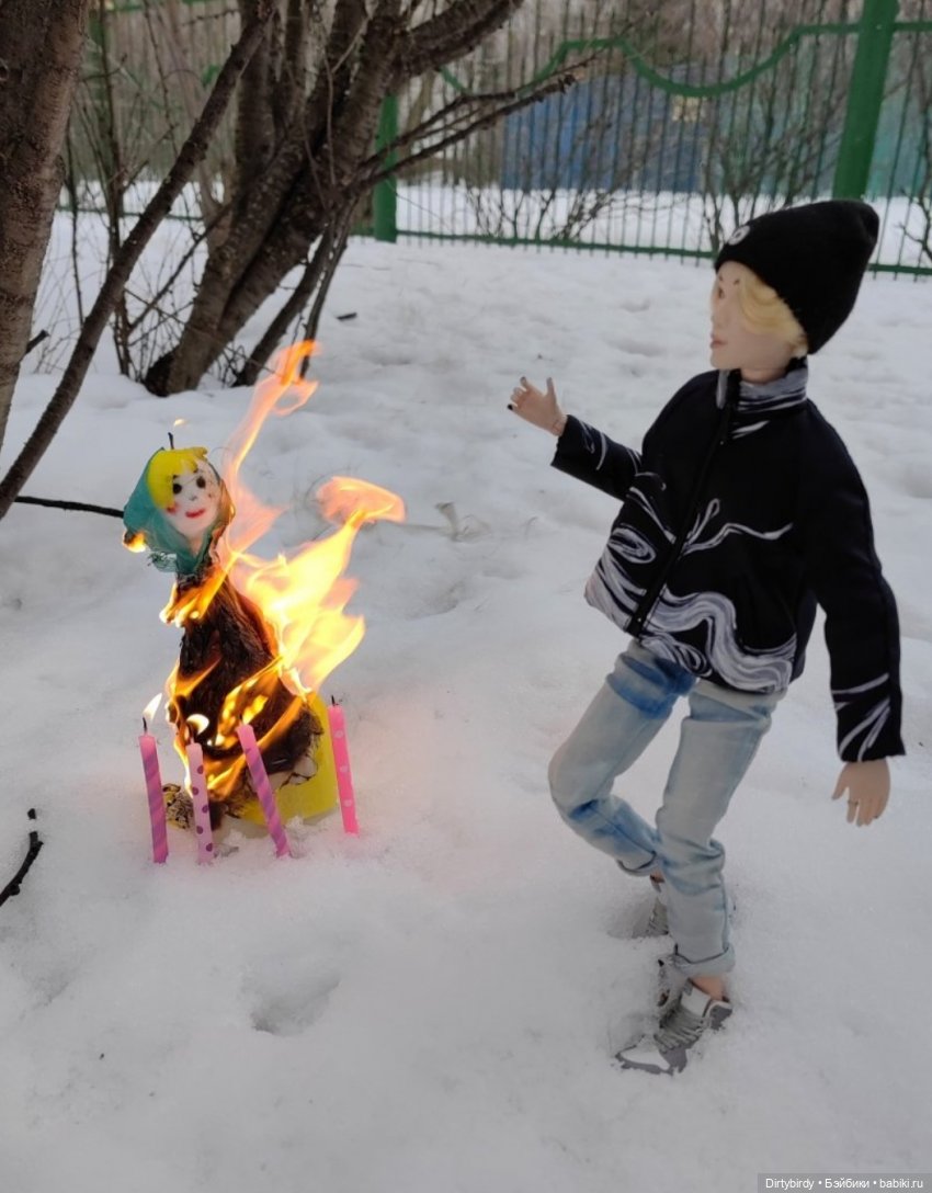 Моё чучело никак зажигаться не хотело, тоже из-за ветра, даже кукол пришлось подальше ставить, а поливала жидкостью, оставшейся от уменьшения голов!