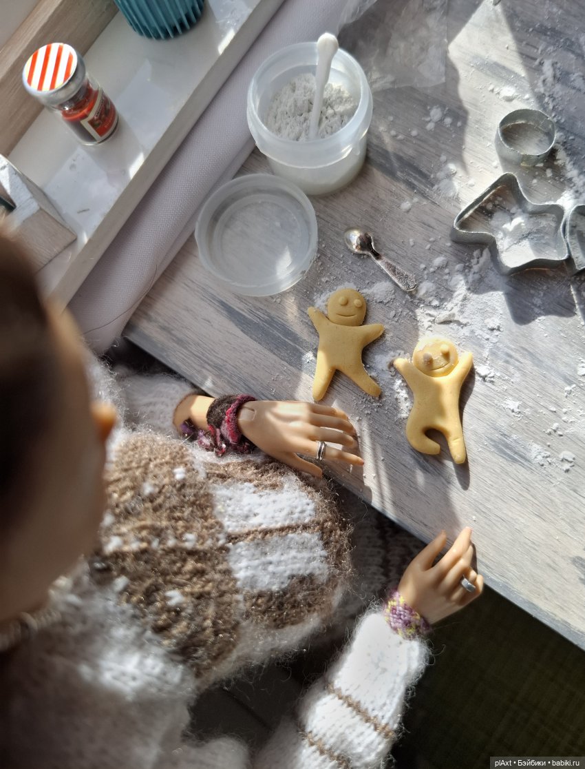 На самом же столе были разбросаны различные фигурные формочки для печенья. Анечка, почти лёжа животом, собирала обрезки теста в один кусок, другой ещё нетронутый, идеально гладкий шарик лежал поотдаль под плёнкой и ждал своей участи.