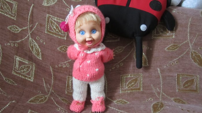 Весна потихоньку вступает в свои права). Снегу у на еще много, но есть уже большие проталины на которых копошатся воробьи и важно вышагивают длинноносые грачи. Скворчики тоже прилетели, но недельный холод угнал их в лес. Вот на этом фоне я и связала малышке Фейсинке Galoob baby face теплый костюм для прогулок. Общий вид и немного подробностей).