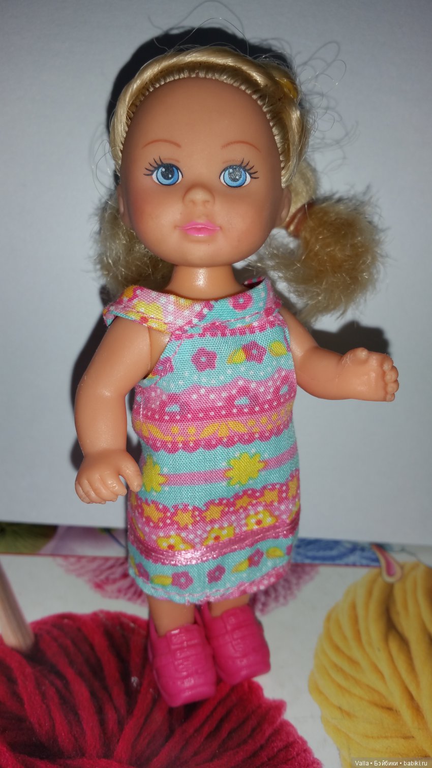 Затем попробовала сшить ей платье (девочка все же), но ещё не доконца приспособилась к такому размеру(15см.). Платье вышло узким и сильно стесняло подвижность куколки в плечах, поэтому не прижилось в гардеробе Еви. Однако пару фото в нем мы успели сделать.