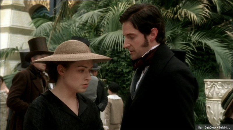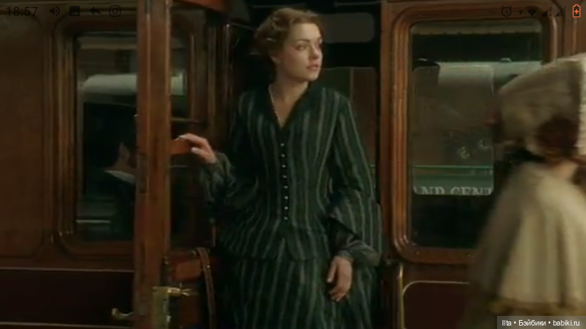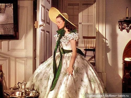 Поскольку визиты обычно наносили до полудня, платье должно было отвечать правилам дневного туалета (отсутствие декольте, открытых плеч и рук). Платье для визитов обязательно дополнялось шляпкой и перчатками. Вот такое платье было у Маргарет в фильме: