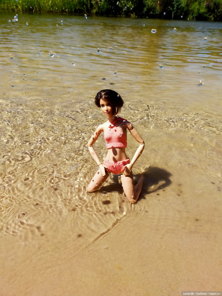 Начну с демонстрации купальника! Сшился накануне отъезда. Очень им довольна. Универсальная вещь получилась, можно и как купальник, и как топ. Рея в речку побоялась. Всё-таки в экшенах есть железные части. Поэтому Китнисс соло.