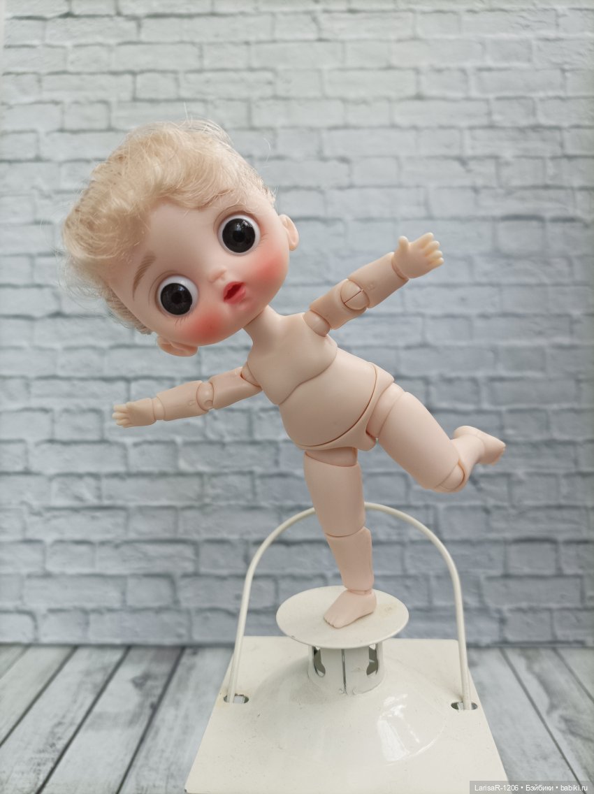 Про эту куклу я уже писала. Началось всё с головы. Увидела в «Монетке» этого глазастика и не смогла пройти мимо. Специально для этой головы было заказано подвижное тело ymy. Это мой первый опыт гибридизации.